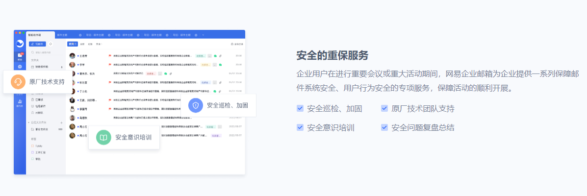 邮件的安全保护是客户最关注的性能指标之一,网易企业邮箱为客户提供反垃圾网关,可以有效过滤垃圾邮件;支持收发信管控,保障用户使用邮件合规;建立安全演练机制提升企业员工安全意识,多举措全面落实邮件安全目标。